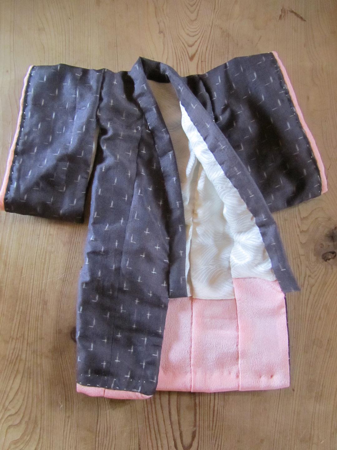 袖は、女の子の振り袖とは違っていて、袖口が、袖下まで開いています。着物の縫い方の本にはなかったので、適当に縫いました。