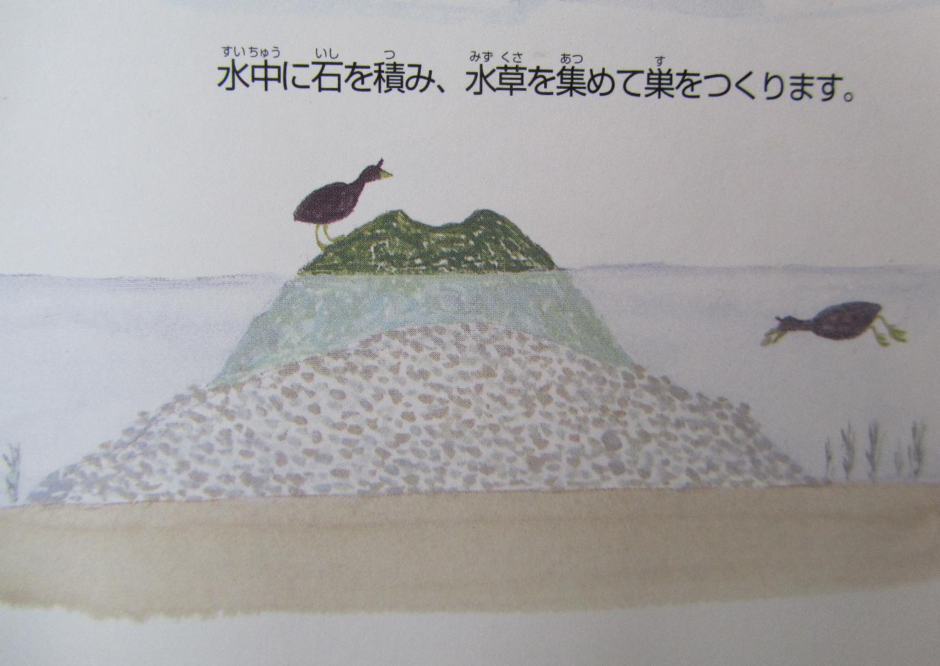 ツノオオバンは、岸から0メートルくらい離れた水の中に、石で巣の土台をつくります。石は一つが500グラムぐらいあるもので、すべて岸から運び、全部で1.500キログラムにもなります(すごい!)。
