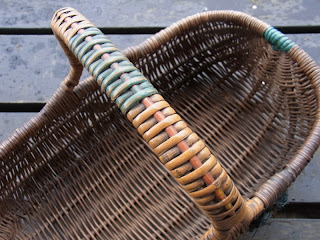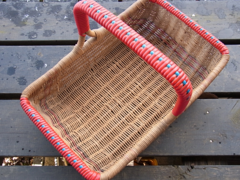 持ち手や縁に補強のために巻いてあるのは、厚くて強いビニールのテープでしょうか。初めて、イギリスの籠を見たころは、そのどぎつさが嫌いでした。