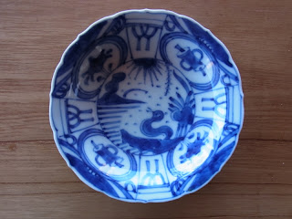 瓢(ひさご)から盃に酒を注いでいる絵が面白くて、五枚揃いで買いましたが、すでに一枚は割れてなくなっています。