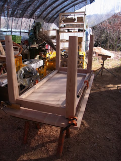 さすがに、脚は組み立てながら同時に甲板につけるのか、それとも足だけ組み立てておいて甲板にはあとで取りつけるのか、決めかねて、お隣の木工家のKさんに聞きに行きました。
