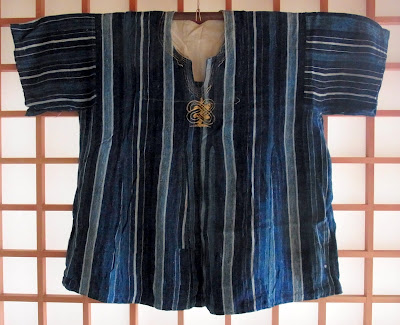 シャツは、手つむぎの糸を藍の濃淡に染め、地機(じばた、いざり機)で縞の細い布に織り上げ、それをつなぎ合わせて仕立てたものでした。