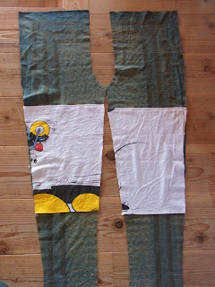 もんぺ布のほかに別布を、ポケット、居敷当て、ひざ当てなどとして裁ちます。