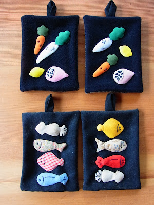 しかも、雑な仕事が得意(?)な母のこと、魚は目やえらを黒糸(刺繍糸ではなく、カタン糸で)刺繍してありますが、野菜の方は蓮根の穴などを、なんと墨(もしかしてマジックインキ?)で描いています!