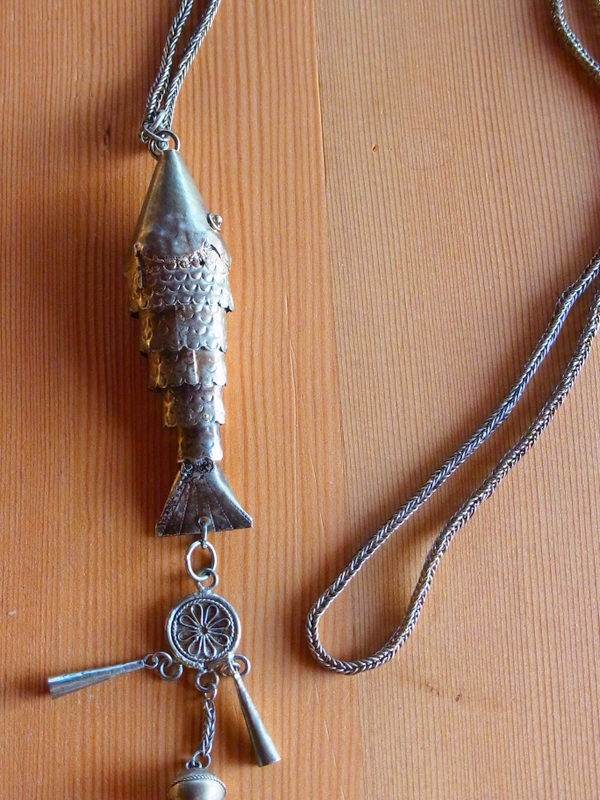 これは、ペンダント部分と紐が一体になった魚のペンダントです。