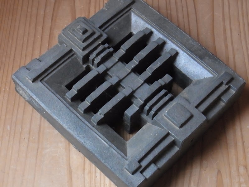 模様の途中には、近所の瓦屋さんからもらってきた、四角い瓦をはめます。この瓦は、瓦屋さんがどこかの注文でつくったもの、余って置いてあった中から四枚いただいて来て、取っておいたものです。