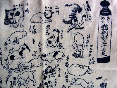 片づけるついでに、てぬぐいをつなぎ合わせて寝巻をつくろうかとひっくり返してみたら、私が子どもの頃に亡くなった「母の叔父」の勤めていた会社の名前の入ったてぬぐいや、浅草「ふじ屋」の「其まま地口 猫飼好五十三疋」のてぬぐいなどあり、しばし見入ってしまいました。