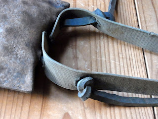 分厚いゴムを切った紐を、ベルの孔に通し、鉄棒をぶら下げ、そして再び孔から外に出したのを、軍隊用品の一部だったような、平打ち紐に二つ孔を開けて、留めてあります。