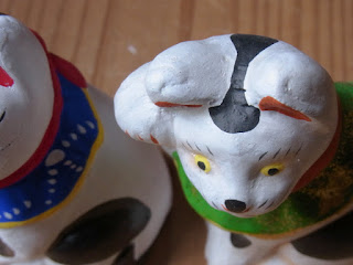 後列左三体が戦前までの丸〆猫、右二体が嘉永安政(江戸末期)のころの丸〆猫、そして前列三体は、今戸人形最後の、生粋の人形師(今戸焼は窯がたくさんあり、瓦や日用雑器など、いろいろ焼いていた)の尾張屋、金沢春吉翁(1868-1944、明治元年-昭和19年)による作をお手本に、いまどきさんが再現されたものです。