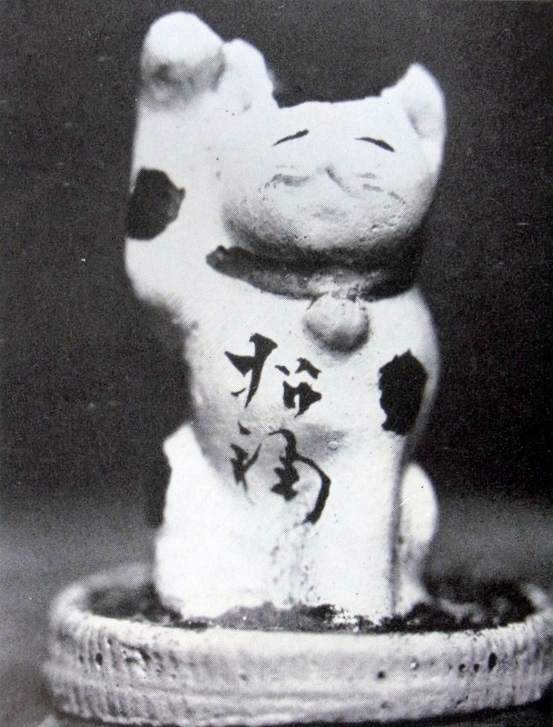 『日本郷土玩具辞典』(西沢笛畝著、岩崎美術社、1964年)には、豪徳寺の招き猫として、この写真が掲載されています。とても小さくてかわいらしいものと書かれていますが、いまどきさんはこれを今戸でつくられたものと見ていらっしゃいます。