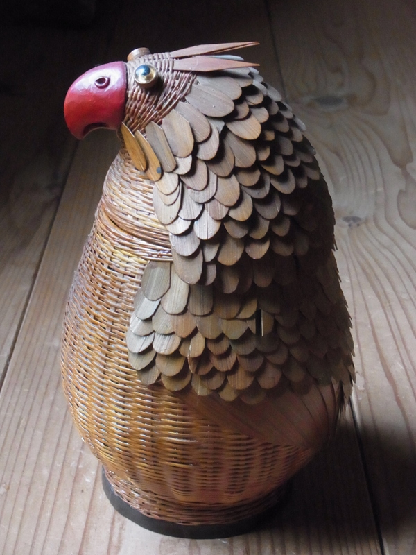 大きい籠では思いつかなかったので、ずっと前に骨董屋のがんこさんからもらった、上海の竹の鶏を見てみました。