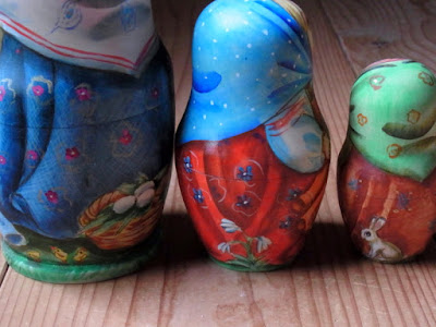 マトリョーシカの胴に描かれた人の姿は、何といっても「添えもの」なのであまり目は行きませんが、この少女たちは堂々と、マトリョーシカの娘と肩を並べています。