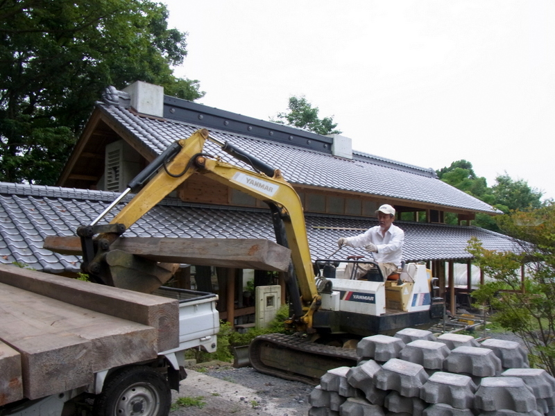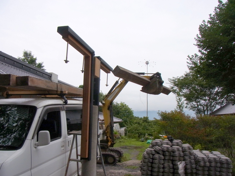 低い屋根とコンクリート門柱の細い隙間から、夫がユンボで、屋根を傷つけないように慎重に材木を取り出し、軽トラックに積みます。