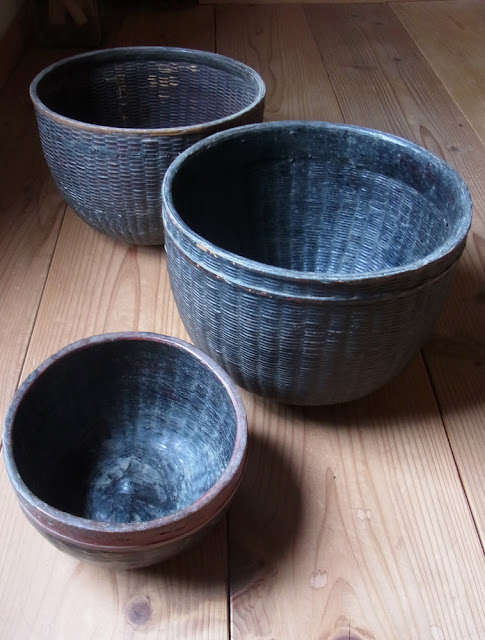 居間の棚の掃除をしていたら、カンボジアの水入れの籠が二つ重ねてあるのを見つけました。