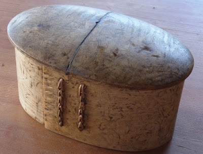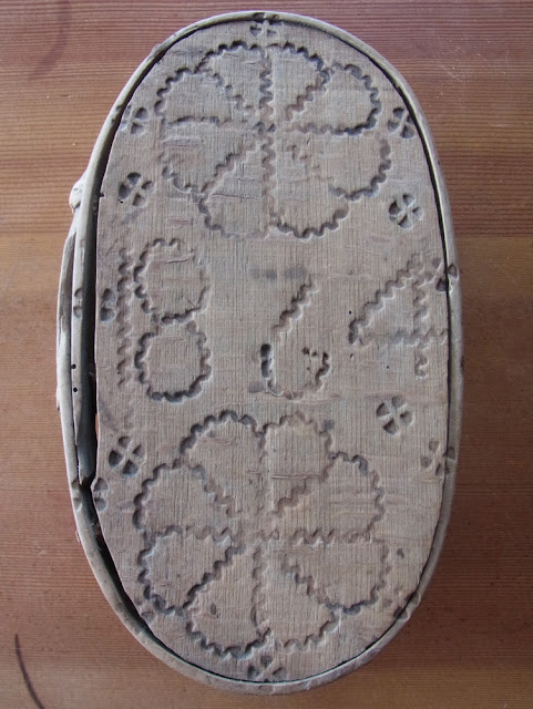 スウェーデンの曲木の箱は、アメリカのシェーカーボックスの底のように滑らかな楕円形でなく、どれも、段差のある曲木の胴に沿って、その形に底板を切り抜いて釘(一つを覗いて木釘)で留めてあります。