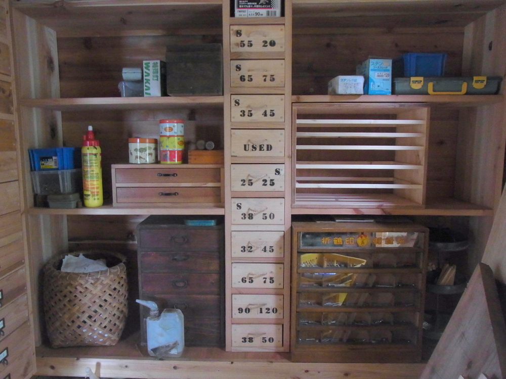 アスファルトを敷いて、大型の工具が使えるようになり、道具入れの引き出しづくりを再開しています。
