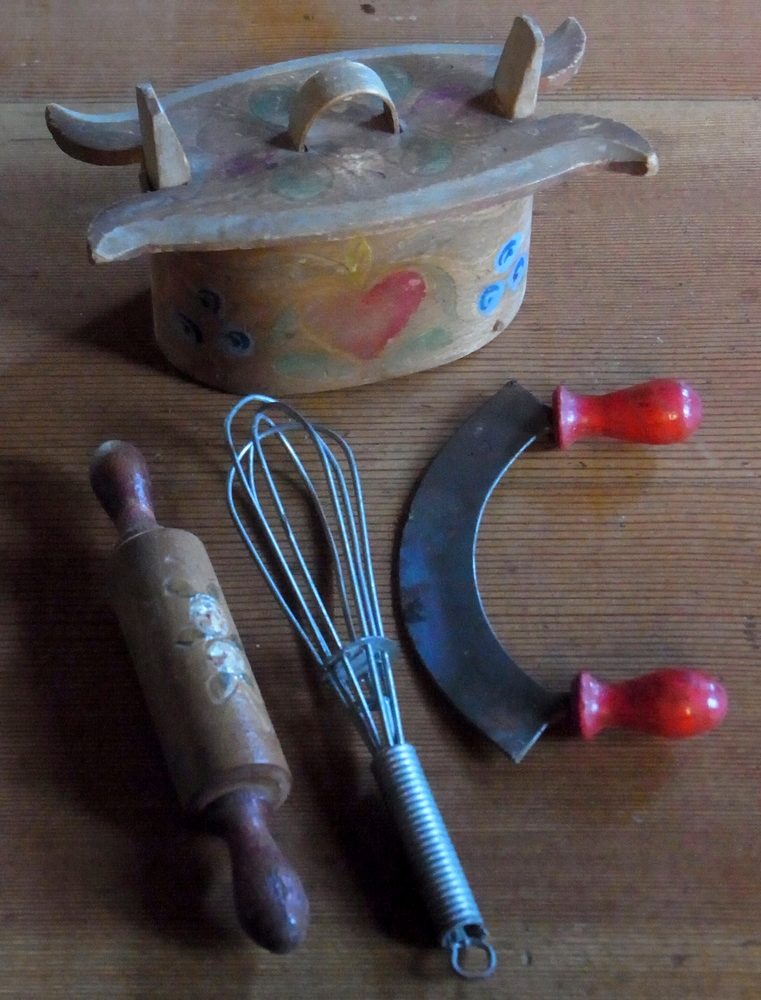焼きごてで線を描いて彩色した、ハート形の花のような模様は、箱の脇には色鮮やかに残っていますが、蓋の方は何度も雑巾でこすられたのか、消えかかっています。