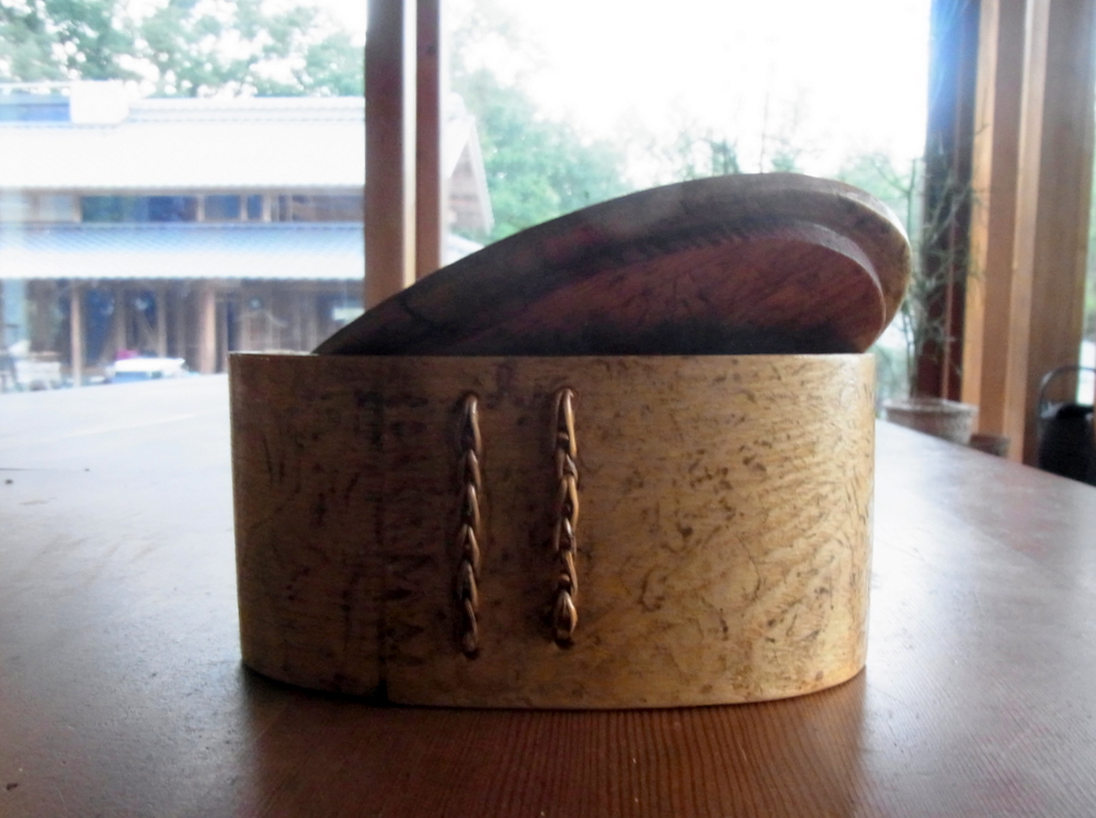 曲木を綴じるのは白樺の木の根で、曲木部分と底と蓋の甲板は、木の釘で留めてあります。