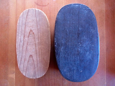 外側(左)は、曲げた木と平らな木をただ突き合わせているだけですが、内側(右)から見ると、繋ぎ目に漆がこってりと塗ってあって、防水対策が万全であることがわかります。