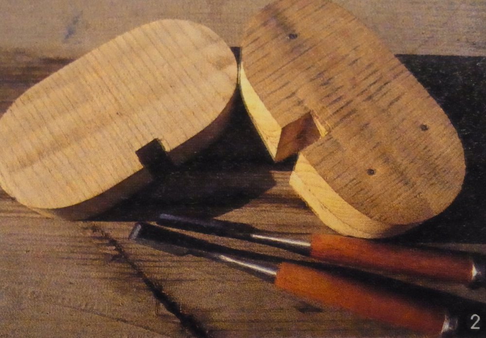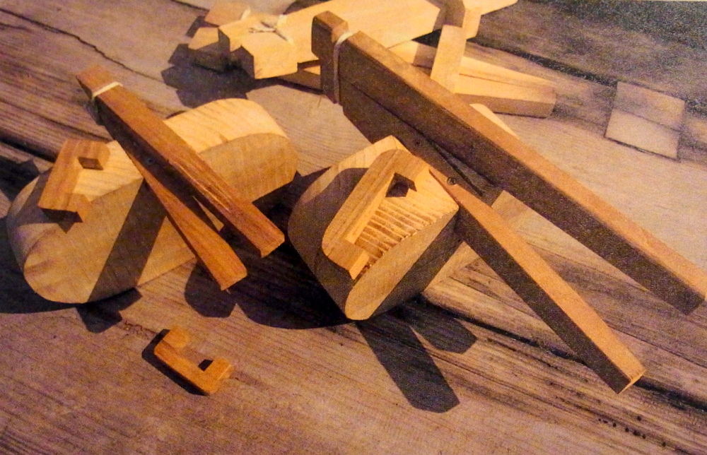 挟み具は、一方の端の支点になる部分は紐で結び合わせ、型に合わせて板をはさんだら、コの字型の木をかませて留めます。