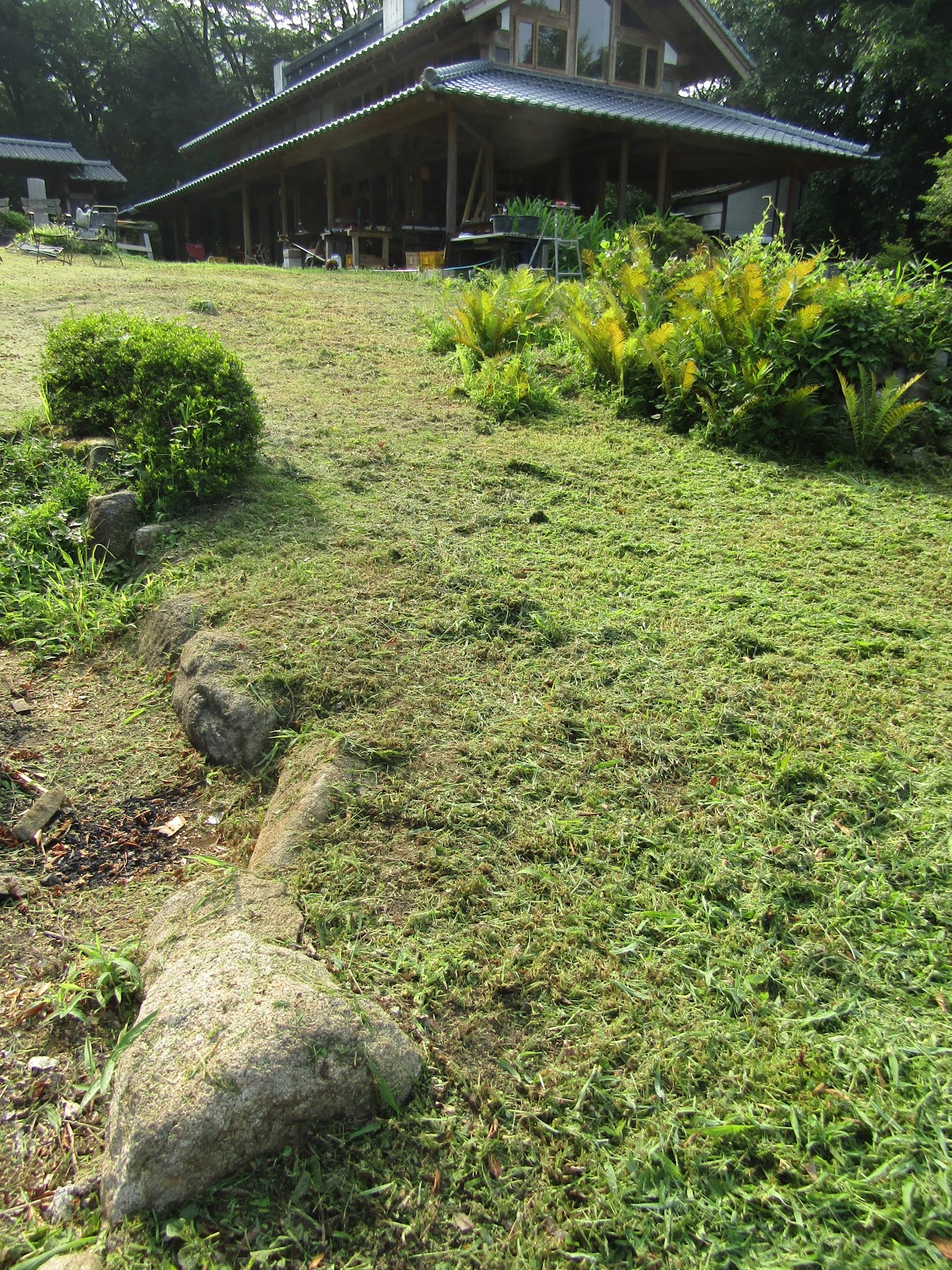 ベンチにするために、元々コンクリートで袖壁を立ち上げておいたところに、夫が足場板で、座と背もたれをつくったのは、しばらく前のことでした。