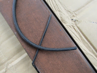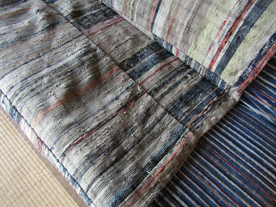 ベンチは長さが240センチあるので、裂き織りの布で包むなら、既成のものに布を足して長くしなくてはなりません。幅は5枚で十分ですが、ばらした1枚を5等分して足したのでは、長さが240センチにはなりません。60センチ長さのものが2枚取れるほどの布が、さらに必要になります。