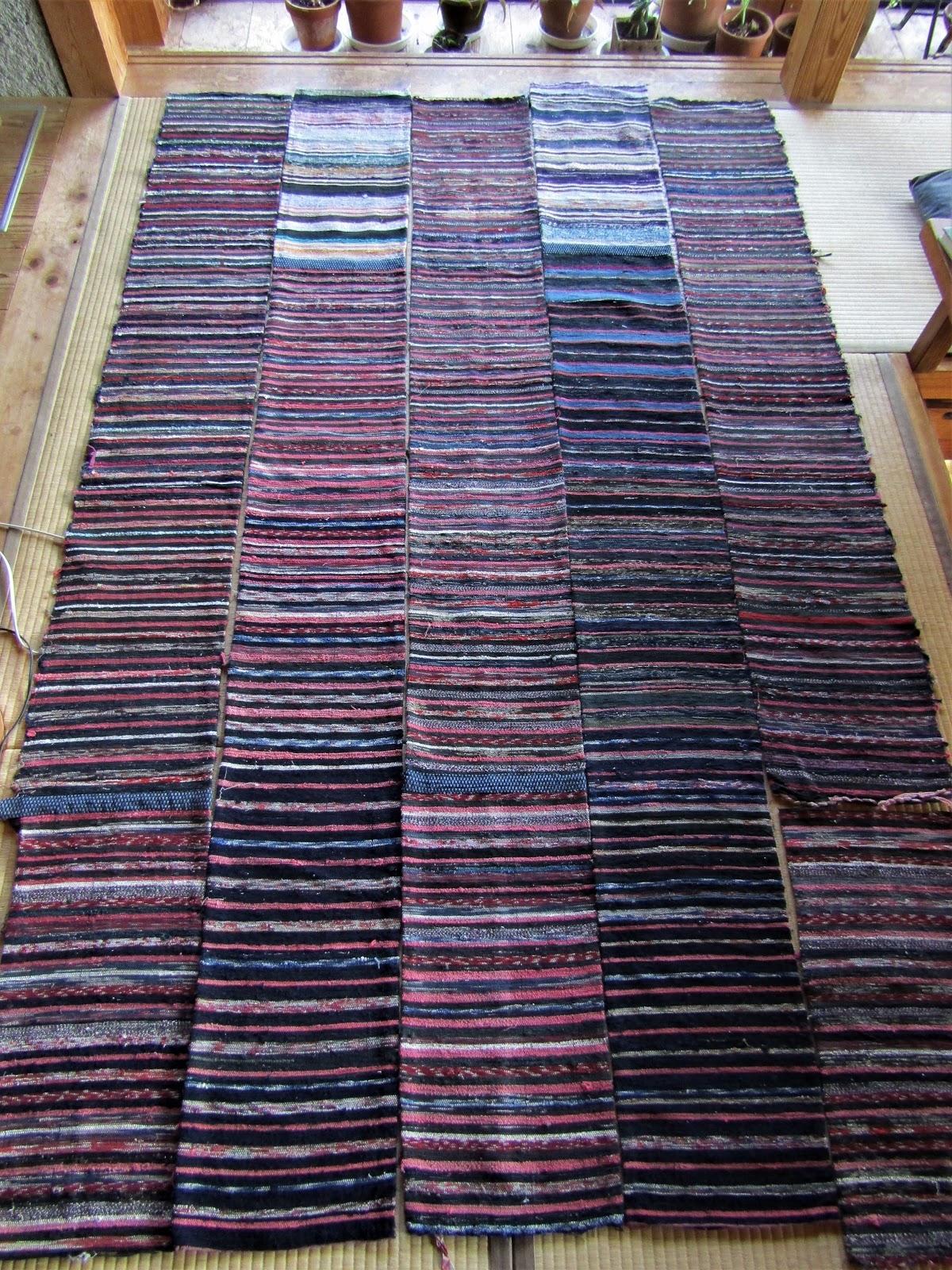 裂き織りは布団やこたつカバー、ときには敷物として織られたものが多く、約30センチ幅に織ったものを180センチほどの長さに切り、5枚、あるいは6枚つないであります。