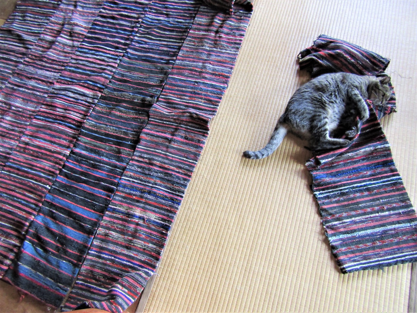 そんなことを、店頭で夫とごちゃごちゃ話していたら、骨董屋さんがおまけに、150センチほどの長さの別の裂き織りを1枚くれることになりました。ちょっと白っぽいのですが、何とかなりそうでした。