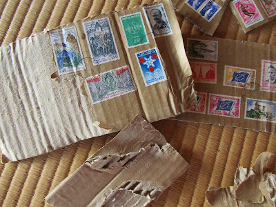 このままでも水は染みますが、早く結果を見たい、切手を曲げないよう、固い段ボールの方を曲げるようにして、はがし取りました。