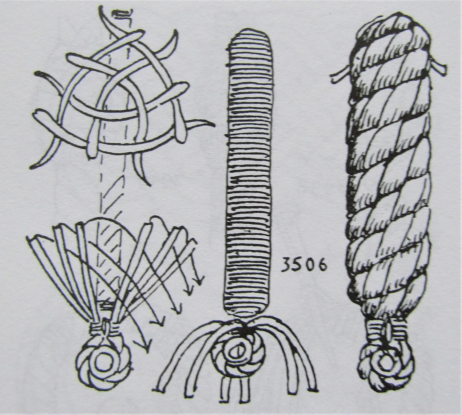 もしかして、結んだもの、組んだものと編んだものは厳密に区別していて、載っていないのかとあきらめたころ、500ページを過ぎてやっと出てきました。