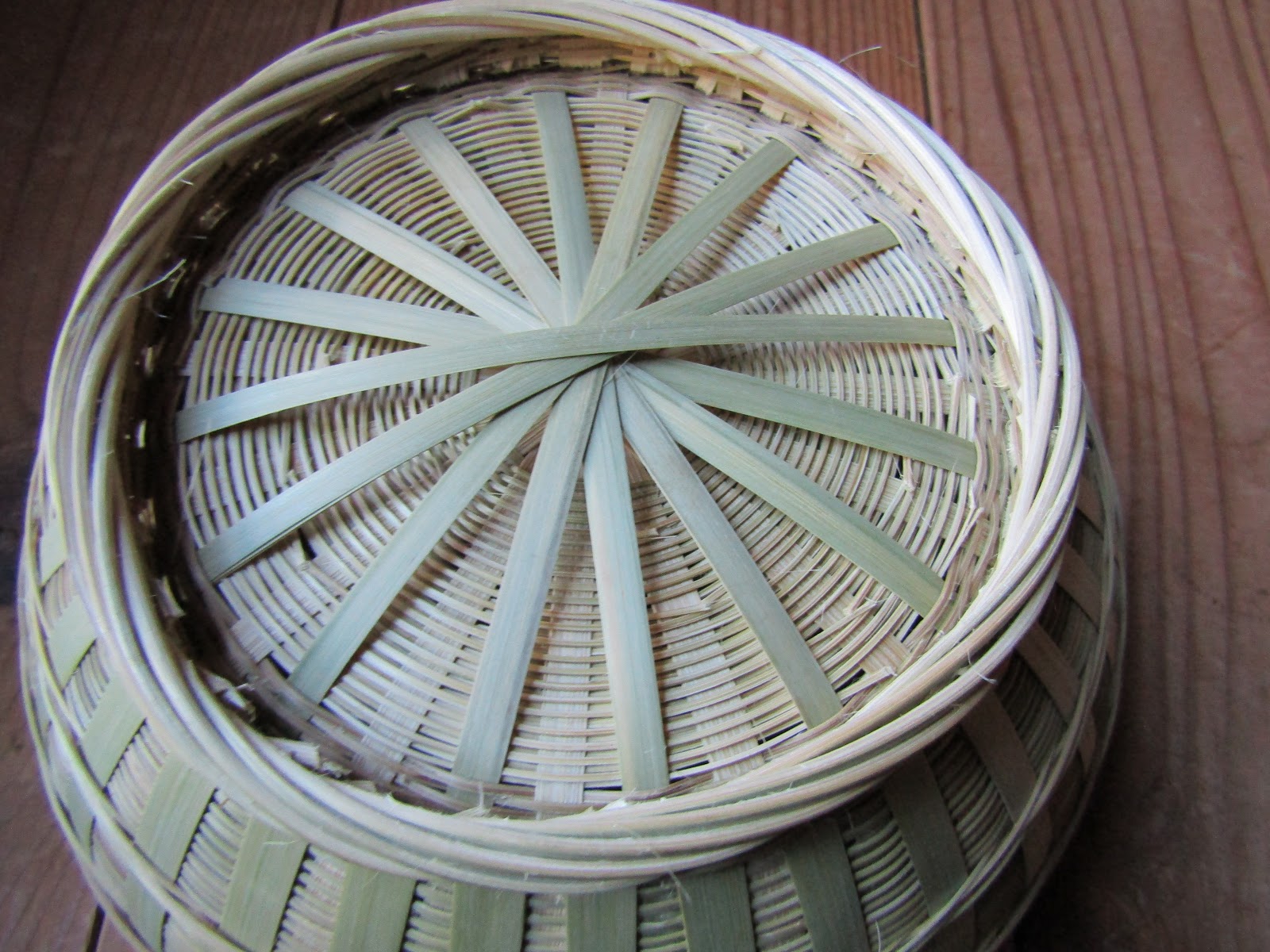我が家にある日本の蓋つきの籠を見ると、蓋はどれも放射状に広がっていく、中国の籠と同じ編み方でしたが、本体の底はいろいろで、蓋と同じ方法のものがあり、違うものもありました。