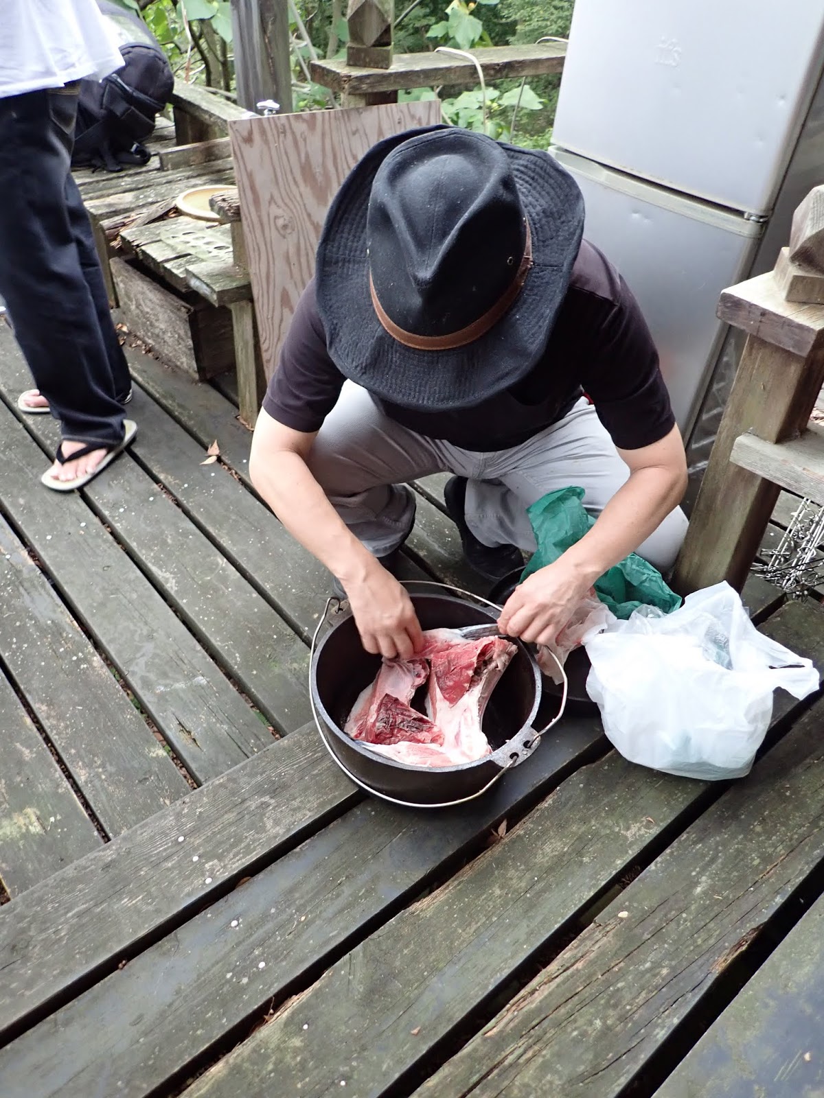 ダッチオーブン歴20年のHさんが、RさんやSさんを誘って来て、ダッチオーブン料理をつくってくれました。
