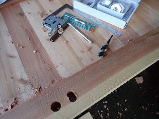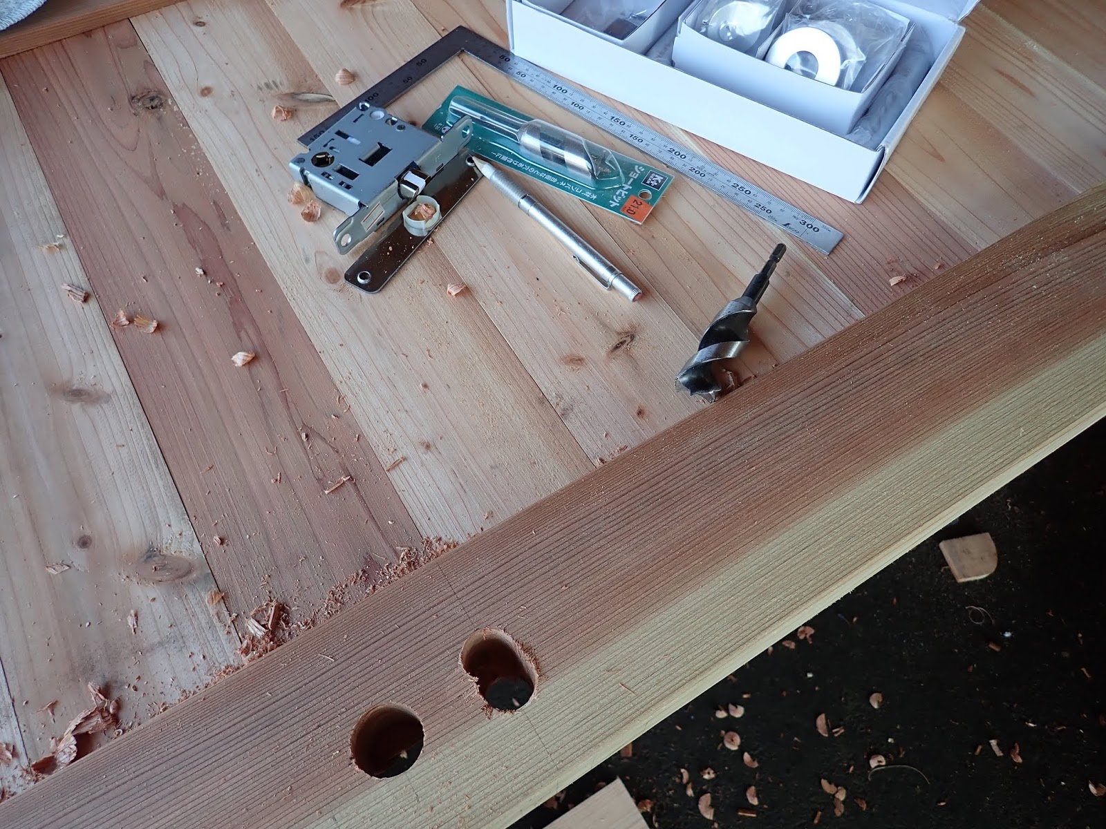 ドリルで開ける穴が重なっているところは、杉は柔らかいので、ともすればドリルの刃が最初に開けた穴の方に滑って、真直ぐに開けることができません。