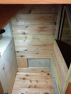 階段下の、ペンキ類の缶を置いているところは、刈り払い機を置いているところとの間に壁をつくって仕切り、出し入れは、左に見える廊下側に扉をつくることにしました。